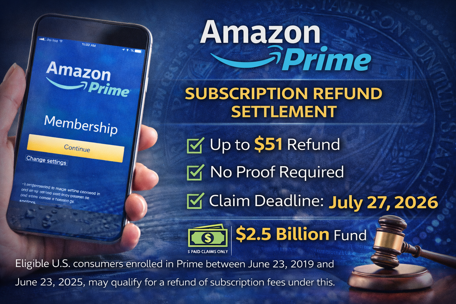 Eligible U.S. Prime members who enrolled between June 23, 2019 and June 23, 2025, used fewer than ten benefits in a 12-month period, and either unintentionally enrolled or were unable to cancel online.