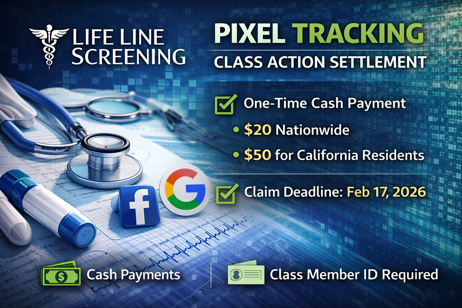 Settlement offers eligible individuals who used Life Line Screening online services a one-time cash payment of $20 or $50 (for California residents) for alleged privacy disclosures via tracking pixels