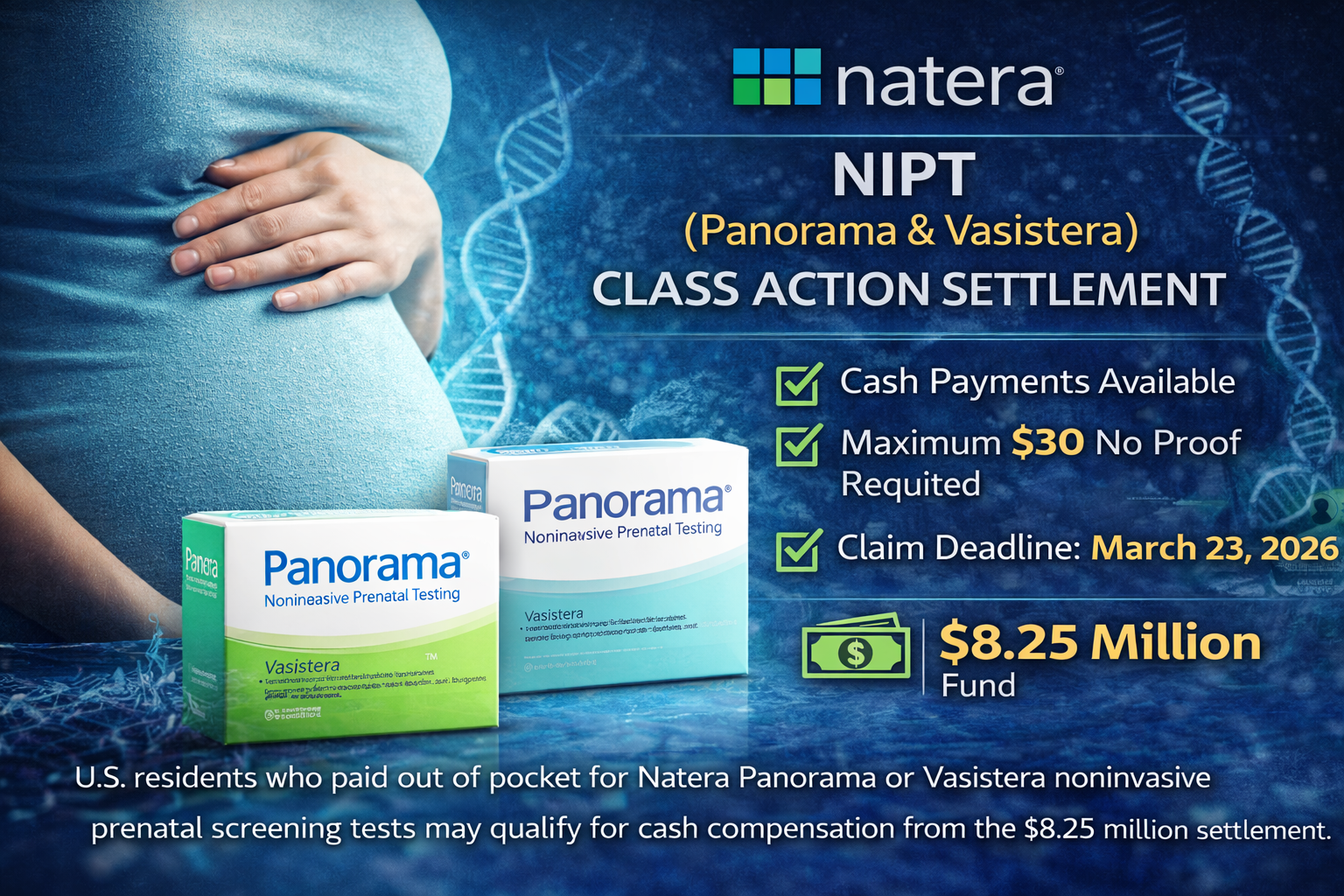 The settlement covers Panorama and Vasistera noninvasive prenatal screening tests (NIPT) paid for out of pocketin the United States — including copay, coinsurance, or deductible — during specific date ranges depending on your state.