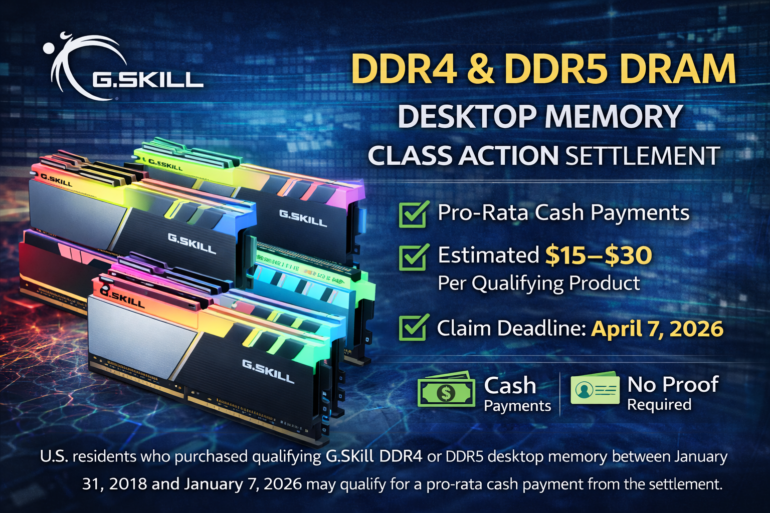 Eligible products include G.Skill DDR-4 desktop memory products with rated speeds above 2133 MHz and G.Skill DDR-5 desktop memory products with rated speeds above 4800 MHz — sold in the United States (excluding laptop/SODIMM memory) between January 31, 2018 and January 7, 2026.