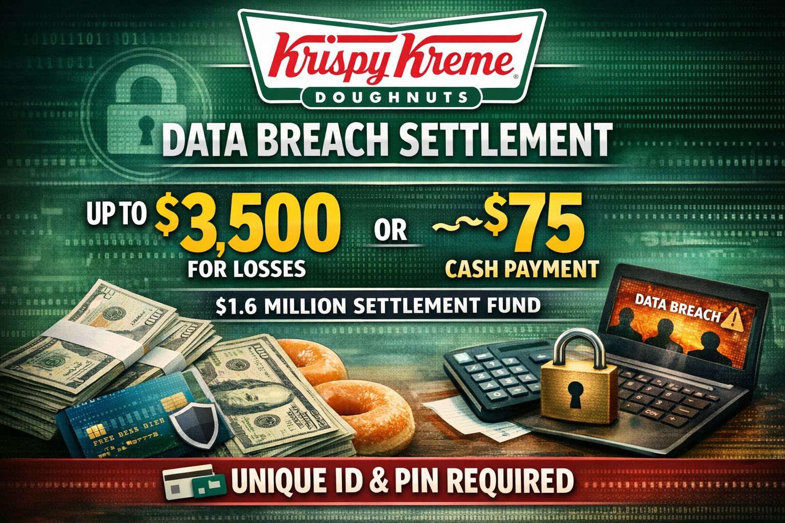 Affected Krispy Kreme employees may receive up to $3,500 for documented losses or a cash payment (estimated ~$75) from a $1.6M data breach settlement.